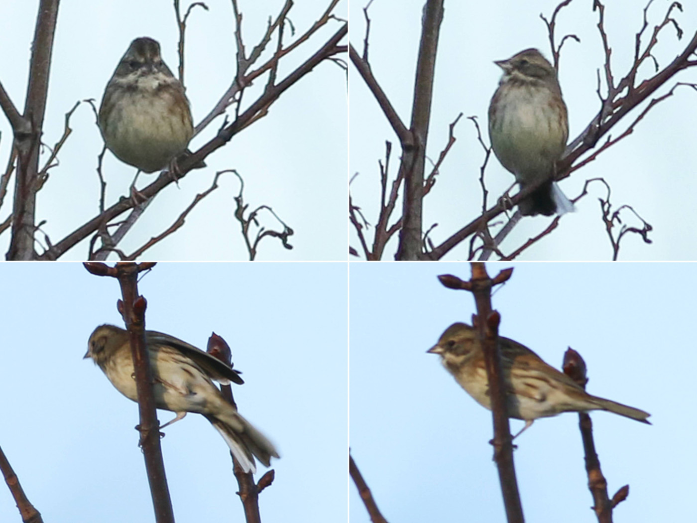 Even voor 11 uur ziet Koen Stork de vogel kort vanaf het karrepad, helemaal aan de achterkant van de tuin. De mensen aan de wegkant zien daarna een gors-achtige vogel uit die hoek wegvliegen, die pas na enkele honderden meters op de akkers neerstrijkt. De verwachting was dat de vogel binding met de tuin zou houden en die dag nog wel terug zou komen, maar het tegendeel bleek waar. Er volgde geen enkele waarneming meer die dag, een teleurstelling voor de ongeveer 200 twitchers van het vasteland.