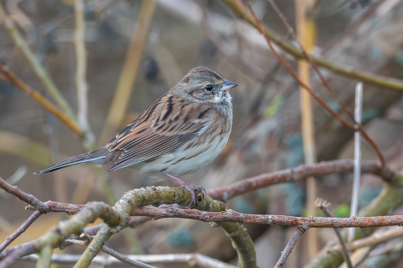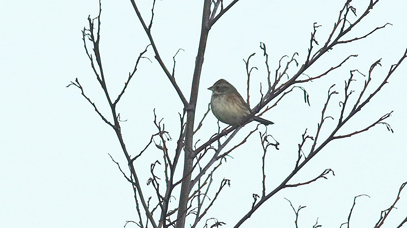 Om 09:31 fietsen we net ten zuiden van de Amaliaweg. Terwijl we wat bijpraten, kijkt Tim rechts van zich, richting een haag aan de rand van een woonerf. Bovenin zit een zangvogel, waarvan het postuur al wat doet denken aan een gors, maar meer dan gokken is nog niet mogelijk. We stoppen en Tim kijkt naar de vogel in de volle verwachting een Rietgors te zien; of misschien niet eens een gors. Zodra de vogel in beeld verschijnt, schiet de adrenaline omhoog. Met wat gesputter komt eruit: “Wat is deze gors?”