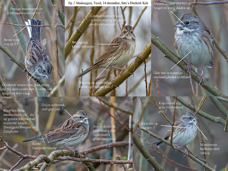 We kijken nog één keer kort naar de foto’s en besluiten dat het inderdaad om een Maskergors moet gaan. Zo’n vijf minuten na de ontdekking sturen we snel een bericht in de Texel Signal-groep en een piepje via DBA. De vogel is inmiddels vlak voor ons de vegetatie van de akker ingevlogen en uit beeld geraakt. Daarbij horen we driemaal een nattig, bijna mechanisch tikje. Na het doorgeven komt de vogel vermoedelijk weer vanuit de tuin aan en duikt opnieuw voor ons de vegetatie in.