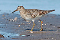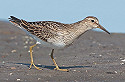 Uitzonderlijk tamme vogel, soms tot op een meter afstand foeragerend. De telelens af en toe maar ingeruild met de landschapslens... Maakte een actieve indruk en was zeer succesvol tijdens het foerageren. Eén keer vloog de vogel roepend op om een half uurtje op het wad te foerageren, maar was snel weer op de dijk aanwezig. Hier met de windmolens van de Emmapolder in de achtergrond.