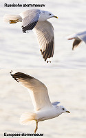 Zie links Europese stormmeeuw L. c. canus met grote witte spiegel op P9, grijs tot aan de basis van de buitenvlag van P8, P9 en P10 (bij deze vogel valt P10 wel mee), dikke witte tongtip op P7 plus asymmetrisch en gebroken bandje op P5 (al heeft Russische stormmeeuw L. c. heinei dat ook wel eens).