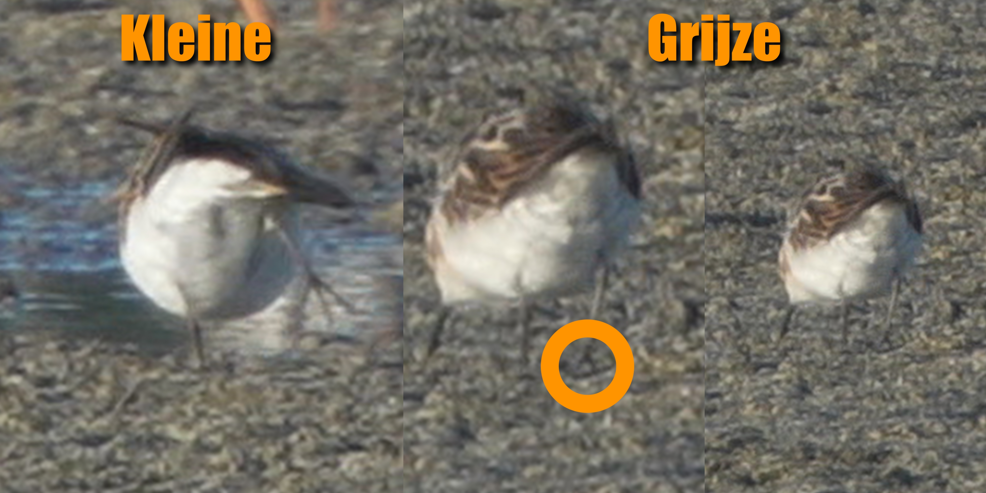 The left bird in my photo is a little stint (the dutch name = Kleine Strandloper, hence the text Kleine above that photo), the middle bird is the putative semipalmated sandpiper (in dutch Grijze Strandloper, hence the text: Grijze above it) and the photo on the right is the same image but zoomed out.