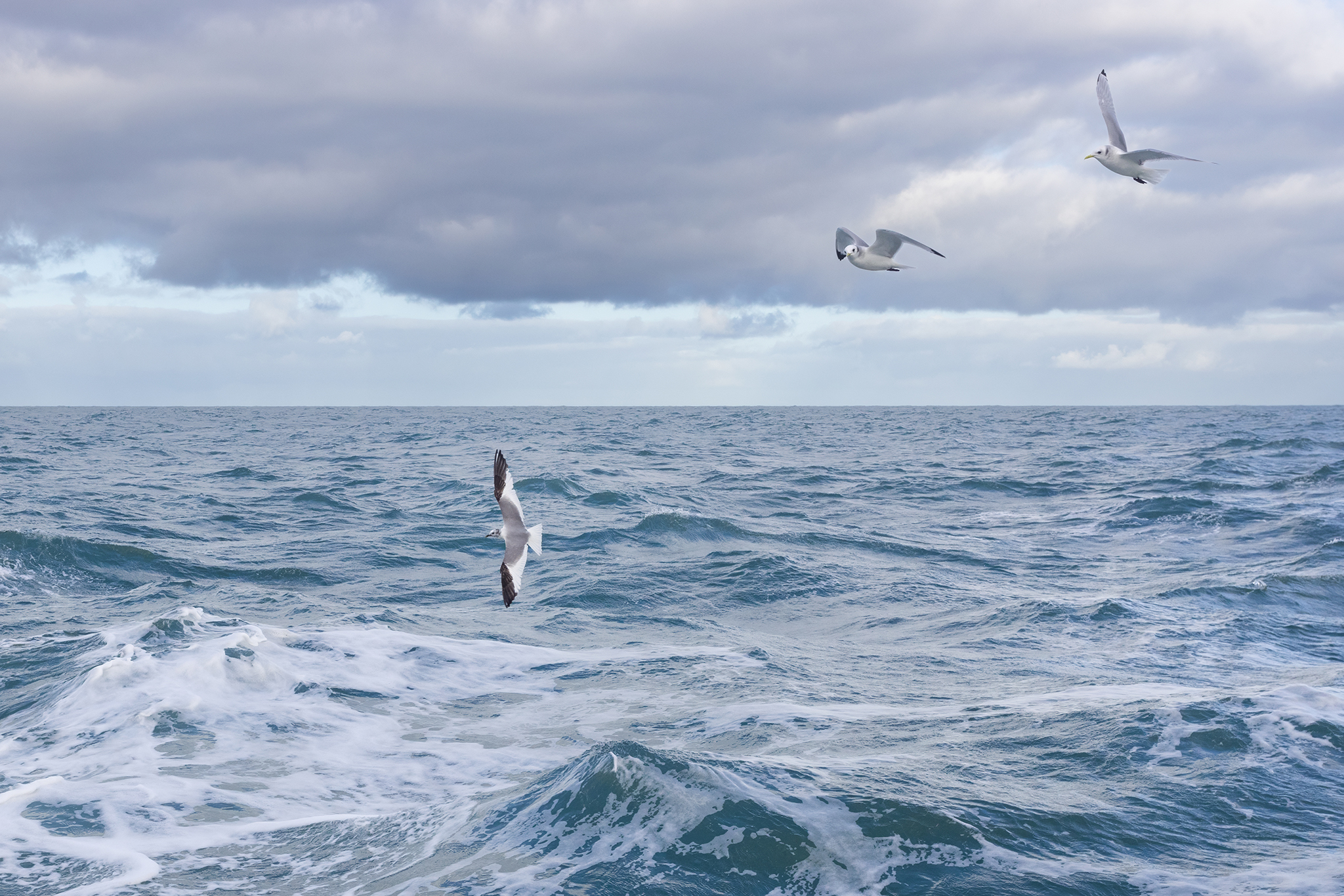 Toen de 'chummer' even een welverdiende lunchpauze inlaste, betekende dat even wat minder activiteit achter de boot. Maar toen we wat oostelijker boven Schiermonnikoog (op zoek naar de Bultrug die eerder die ochtend werd waargenomen vanaf de Marlijn) voeren en er weer gevoerd werd, hing de Vorkstaartmeeuw er binnen no-time weer tussen. Zo dichtbij dat ik de landschapslens er even op heb geschroefd voor een sfeerplaatje. |