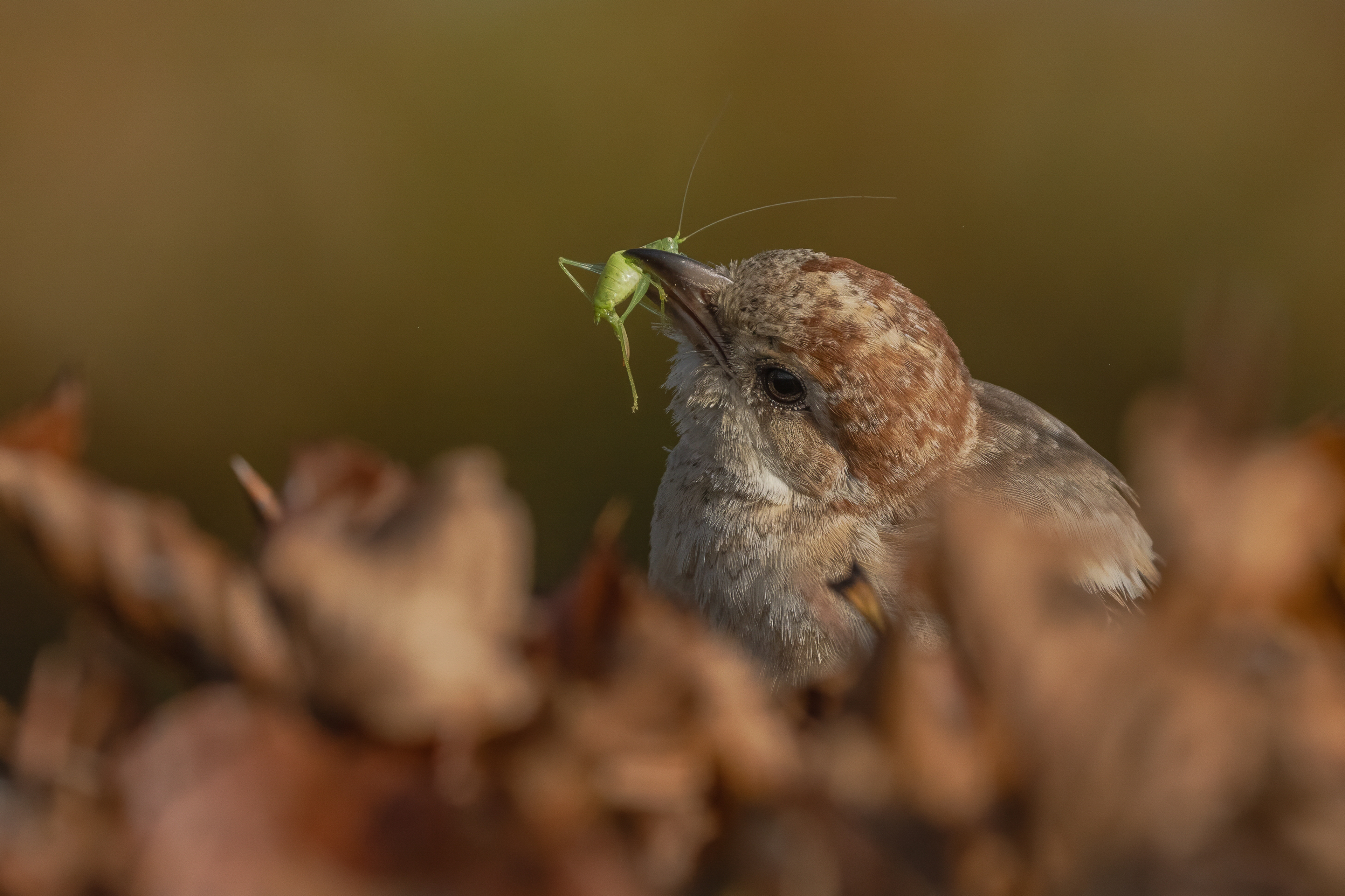Met een Struiksprinkhaan in zijn snavel. Leuke mysterybird, ik zat eerst aan een wever uit Oman te denken!