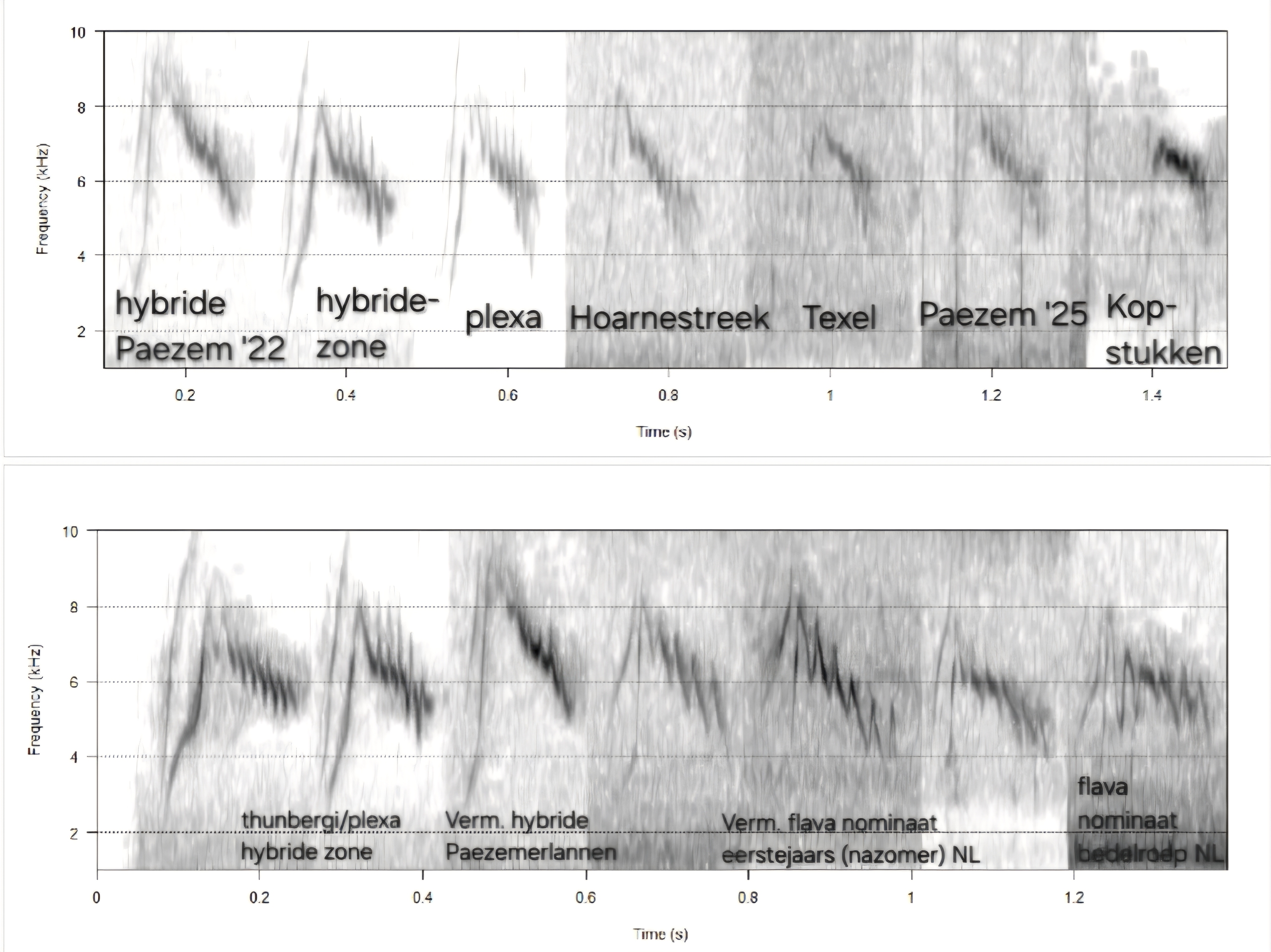 Nog eens alle westelijke plexa vergeleken met de opname ''hybride zone''. Laatste is echt opzichtig anders. Tragere modulatie en dat de ''stokjes'' aan het begin verder uiteen staan blijkt ook consistent anders bij de ''echte'' plexa. De Paezemerlannen hybride heeft wel weer van die krappe stokjes als een echte plexa, maar alsnog tragere en ondiepere modulatie. Laatstgenoemde is echter geen broedtijd opname, dus misschien niet helemaal een eerlijke vergelijking.