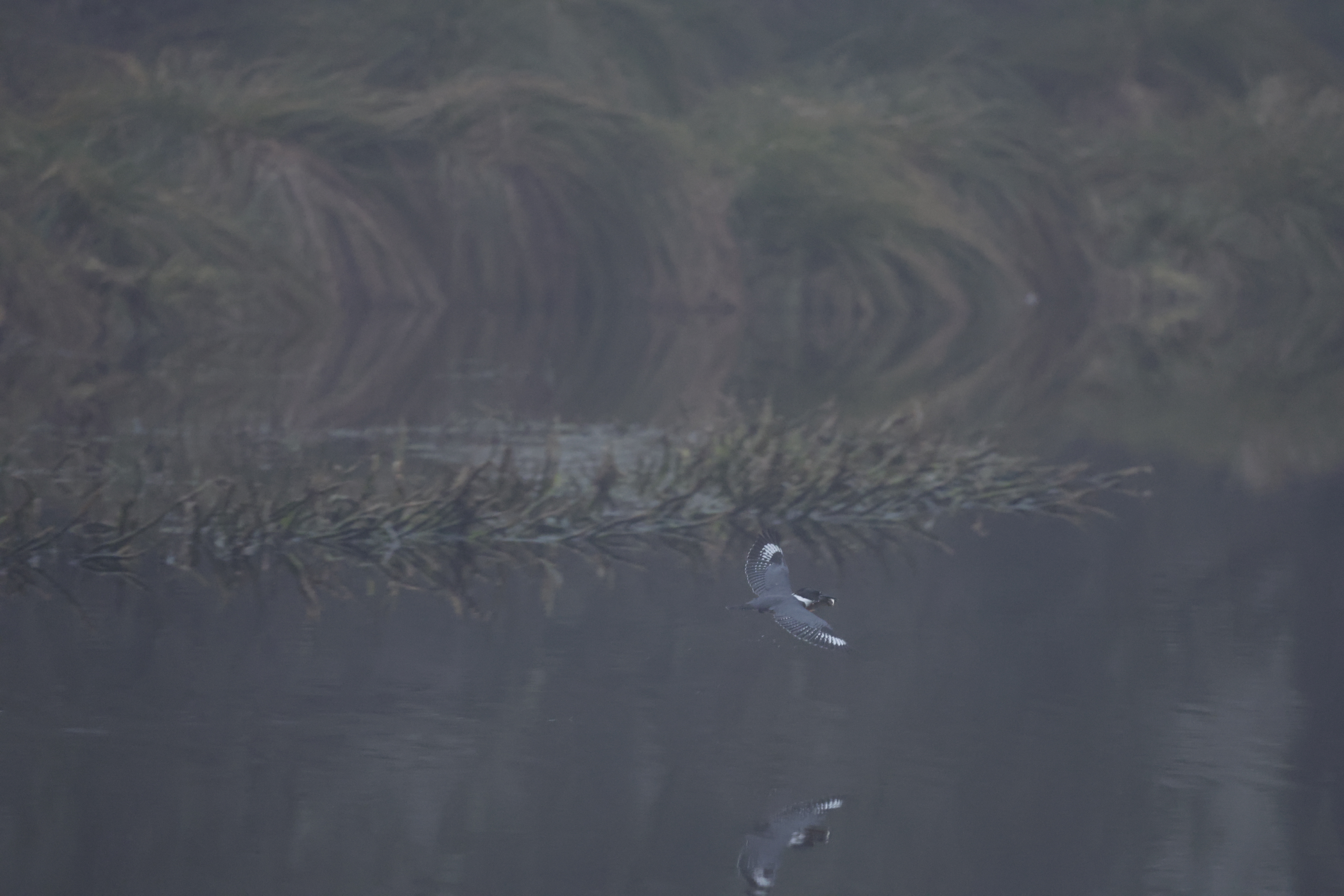Op 13 november 1872 om 07:35 uur ’s ochtends werd door Claude Monet Impression, soleil levant gemaakt dat wordt gezien wordt als het eerste schilderij van de stroming Impressionisme. Dat was in Le Havre, niet ver van de locatie van deze Bandijsvogel. Ik snap sinds gisteren beter waarom juist hier en waarom in de ochtend. Worstelend met het ochtendlicht en de nog aanwezige mist was het mij gisteren snel duidelijk dat er zo vroeg geen fatsoenlijke plaatjes gemaakt gingen worden. Het gevolg was dan dat er dan maar wat wordt aange-Claude. Deze vogel was overigens erg succesvol en ving drie kleine visjes binnen het kwartier. Hij ging er dan steeds vandoor naar een struik in de achtergrond om even uit te buiken. Bij een misser hetzelfde pad, alleen dan luid kekkerend en scheldend over zijn eigen falen. Na een half uurtje hield hij het voor gezien en verdween hij definitief naar achteren. Eerste voor Frankrijk. Ze zijn niet vaak te bewonderen in Europa. Wel in de WP want ze laten zich bijna jaarlijks zien op de Azoren. |