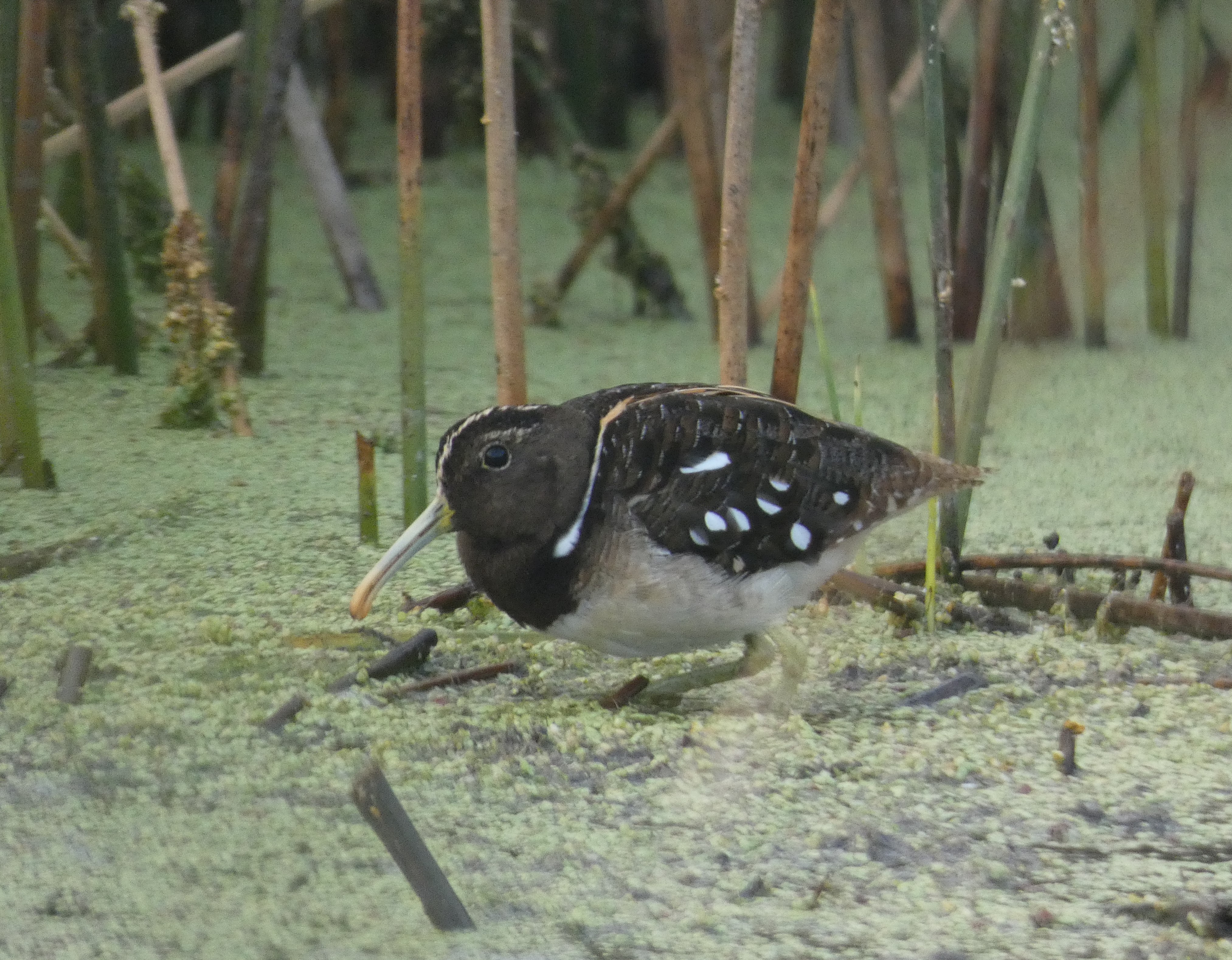 Dit is een zelden waargenomen soort, vanwege zijn onvoorspelbaarheid qua opduiken. Lonnie Bregman tipte ons dat dit gebied, drie uur van Buenos Aires, een goede kans gaf op het vinden van de soort, maar dat we op twee opeenvolgende dagen drie exemplaren (desgewenst) urenlang op ooghoogte op 4m afstand zouden hebben hadden we niet kunnen bevroeden. Af en toe werden ze weggejaagd door Plumbeous Rails; van de Wren-like Rushbirds, die er als neotropische waterrietzangers naast foerageerden, hadden ze minder last. En kennelijk ook niet van ons. We zagen een strak uitgekleurd exemplaar en twee mindere goden waarvan dit er één is. In tegenstelling tot de Afrikaans-Aziatische Greater Painted-snipe (Rostratula benghalensis), die grappig genoeg in een ander genus zit, zouden de sexen bij deze neotropische soort gelijk moeten zijn, dus we hadden kennelijk niet met één vrouw en twee mannen te maken. Van mij hoeft een foto niet zo perfect, ik houd meer van wat zichtbaar habitat. Hier loopt een rietstengeltje voor de achterzijde van de vogel langs en dat is ook precies hoe je zo'n soort vaak ziet. Wellicht plaats ik nog zo'n verre-van-perfecte foto. Die van Dave van der Spoel zijn overigens wel nagenoeg perfect :-) |