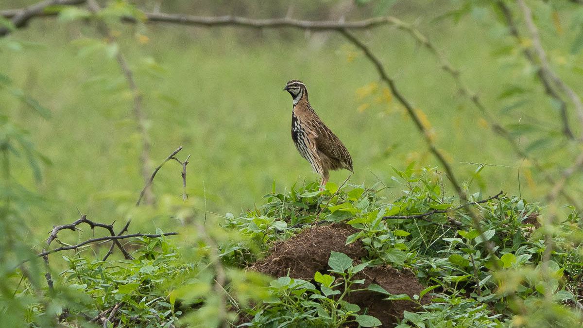 In the afternoon of 12 Aug 2025 we flew from Surat to Jaipur, where our trusted driver Roop Lal and a second vehicle were waiting for us; we drove straight to the village of Tehla, south of Sariska Tiger Reserve, as this area holds frequent Painted Spurfowl sightings, one of my remaining targets. Upon checking in at one of the lodges we were told the road heading north from Tehla, through the reserve, was closed during the monsoon, and only from the north a short safari could be booked that would take us to a fortress inside. Although Tiger sightings are not impossible during the monsoon, they are very rare, but we figured such a safari would at least give us a reasonable chance of encountering Painted Spurfowl and perhaps Painted Sandgrouse as well, the other major target we hadn’t encountered yet. We decided to try the safari on 14 August, as it did not run on 13th.