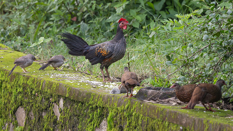 Grey Junglefowl Gallus sonneratii and three Red Spurfowl Galloperdix spadicea caurina, with two Jungle Babblers Argya striata sindiana and a Northern Palm Squirrel Funambulus pennantii, near Rudra Villa, Mt Abu, India, 7 August 2025 (Alwin van Lubeck)