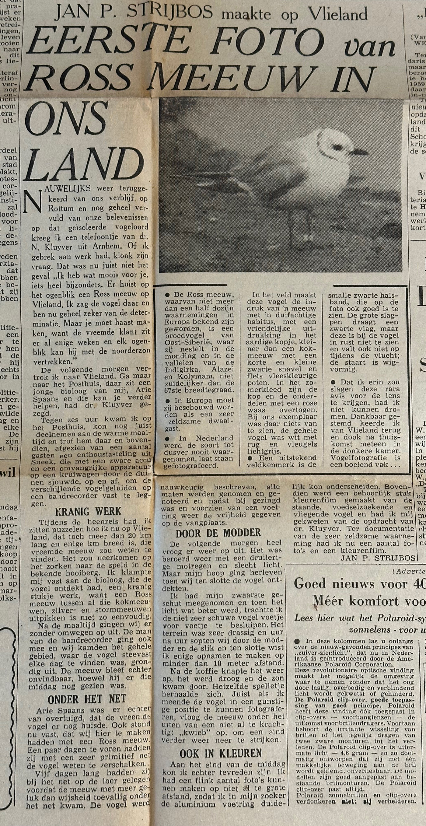 Oud krantenartikel uit De Telegraaf: eerste foto van Ross' Meeuw in Nederland; artikel is van dinsdag 1 juli 1958 (Pim de Nobel)