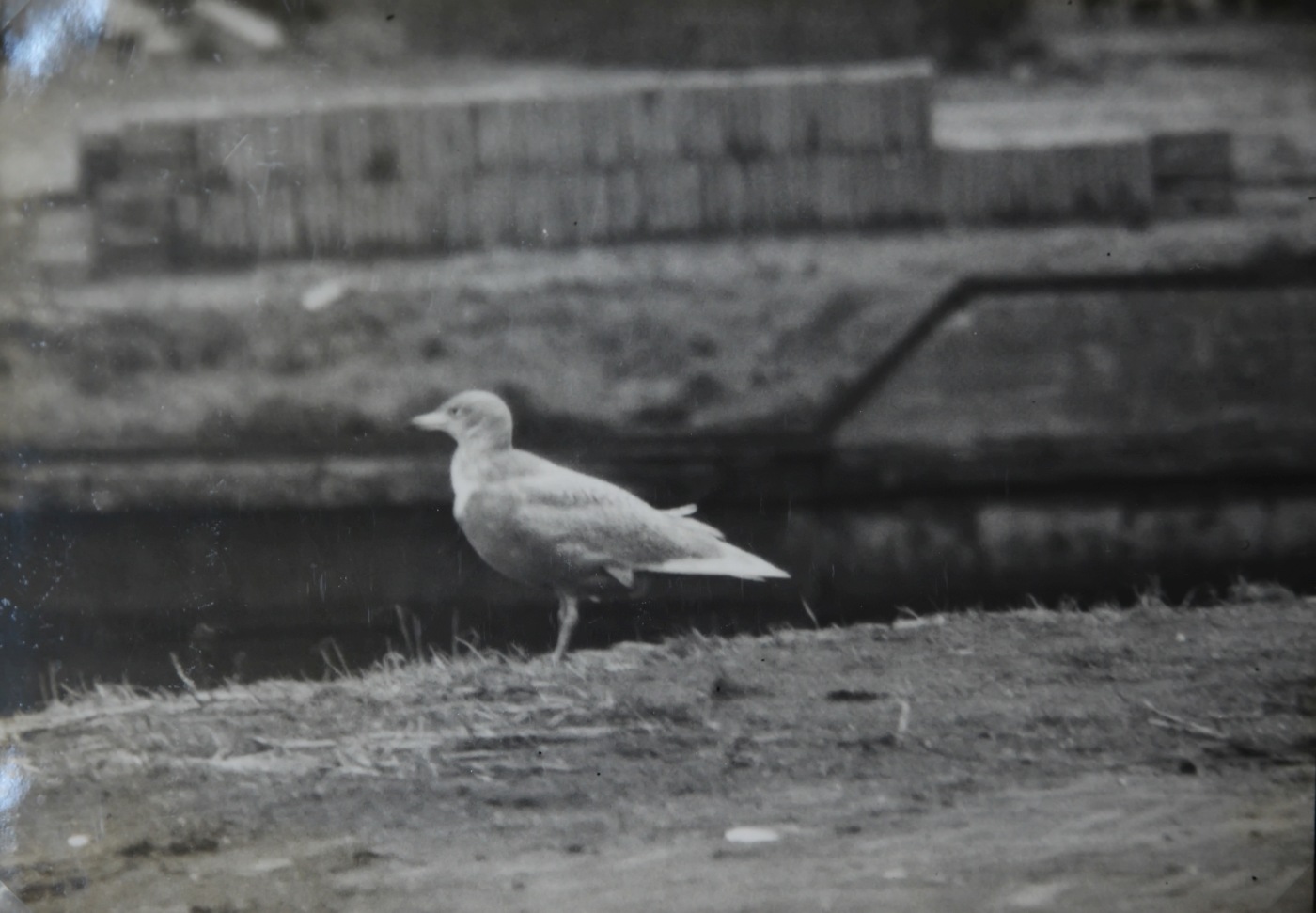 De eerste foto ooit van een schaarse soort in Katwijk: een eerste winter Grote Burgemeester Larus hyperboreus, gefotografeerd vanuit zijn werkplek aan het Prins Hendrikkanaal te Katwijk aan Zee door Fokko Niesen (de vader van Harm Niesen). Foto niet gedateerd, maar het zal in de vijftiger jaren van de vorige eeuw zijn geweest.