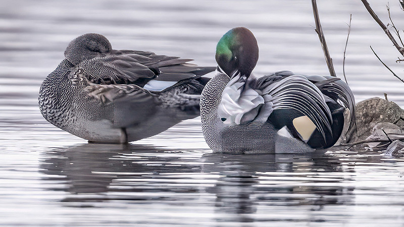 De Bende van Breskens, die overigens over een substantieel deel van de zuidkust van de Westerschelde kan worden waargenomen, telde deze maand maximaal 38 Witbuikrotganzen. Dat is meer vogels dan er van deze soort - of ondersoort, zo u wilt of binnenkort gaat willen - in de rest van het land werden vastgesteld. Een “minibende” op Neeltje Jans telde vijf exemplaren, op`17 januari; verder betrof het vooral solitaire exemplaren, op de plekken die u allemaal wel kent. Zo goed als alle Zwarte Rotganzen werden gezien in noord-Noord-Holland en op de Waddeneilanden, met uitzondering van een of enige vogels op Schouwen (Zld) en Goeree (ZH). In 62 uurhokken werden Roodhalsganzen gezien, met groepjes van vier op Ameland (Fr) op 16 januari, bij Piaam (Fr) op 22 januari, vier bij Yerseke (Zld) op 25 januari en drie bij Ooltgensplaat (ZH), op 30 januari. Een Kleine Canadese Gans van de ondersoort Hutchins Canadese Gans, de ondersoort die in Nederland als "mogelijk van wilde herkomst" te boek staat, werd van 10 tot 12 januari gezien bij Kloosterhaar (Ovl).en waarschijnlijk twee dagen later bij Wierden (Ovl). De laatste Taigarietganzen die Nederland in de winter aandoen, doen dat altijd op plekken die voor normale Nederlanders bijna oneindig ver weg zijn - behalve voor de mensen die er in de buurt wonen, natuurlijk: rond Stadskanaal (Gr) en bij Assen (Dr). Waarnemingen elders waren minder duidelijk, of betroffen niet-wilde vogels. Maximaal 55 Dwergganzen werden deze maand gezien in het Oudeland van Strijen, en maximaal 25 nabij Petten (NH). Zoals we allemaal weten, mogen deze aantallen niet bij elkaar worden opgeteld, want het is bekend dat de vogels als gekken heen-en-weer vliegen. In slechts 23 uurhokken werden IJseenden gezien, zoals u zult begrijpen allemaal aan de kust of het IJsselmeer. Een groep van acht aan de Noordsvaarder op Terschelling op 11 januari vormde het hoogtepunt. Nu de Brileider er geen kans meer op maakt, is het tijd om ons weer te wijden aan de trofee voor de Eend van de Maand! Deze ging in januari zonder enige twijfel naar de Brilzee-eend die werd ontdekt naast de boot van Lauwersoog naar Schiermonnikoog. Helaas waren de foto's niet echt geschikt voor publicatie. De Buffelkopeend van Almere (Fl) bleek meestal lastiger dan gedacht. De vogel was wel de hele maand aanwezig in de Pampushaven, maar soms zeer moeilijk of helemaal niet te vinden.
